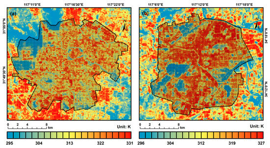 LST inversion results of (a) Hefei and (b) Xuzhou with 300 × 300 m grids.