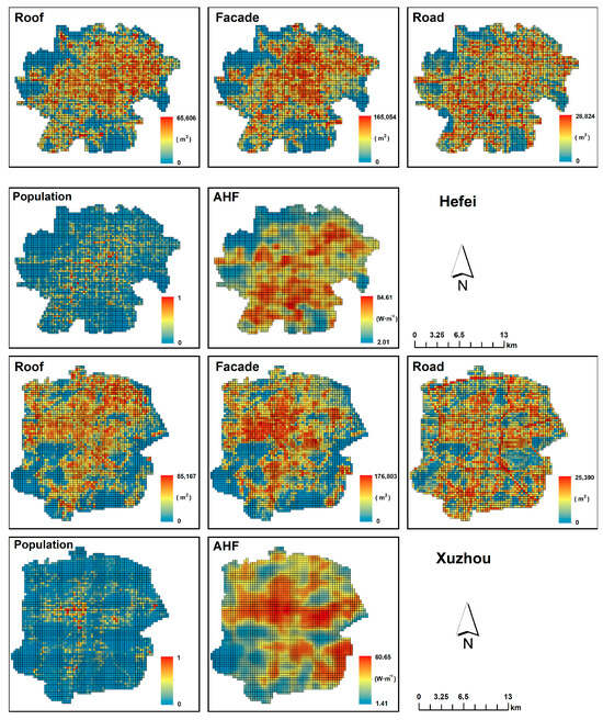 Further analysis revealed a strong correlation between roof and facade (0.586 in Hefei and 0.615 in Xuzhou), indicating that sunlight exposure on roofs and facades often increases simultaneously in high-density areas. The correlation between road and population was moderate in both cities (0.377 in Xuzhou and 0.383 in Hefei), suggesting that denser populations are typically associated with greater road coverage. Additionally, the correlation between road and AHF was 0.467 in Hefei and 0.394 in Xuzhou, indicating the connection between road traffic and heat emissions. Finally, the correlation between facade and AHF (e.g., 0.461 in Xuzhou) implies that high AHF levels often coincide with areas featuring large facades, such as commercial zones with high human activity, contributing to localized heat accumulation.