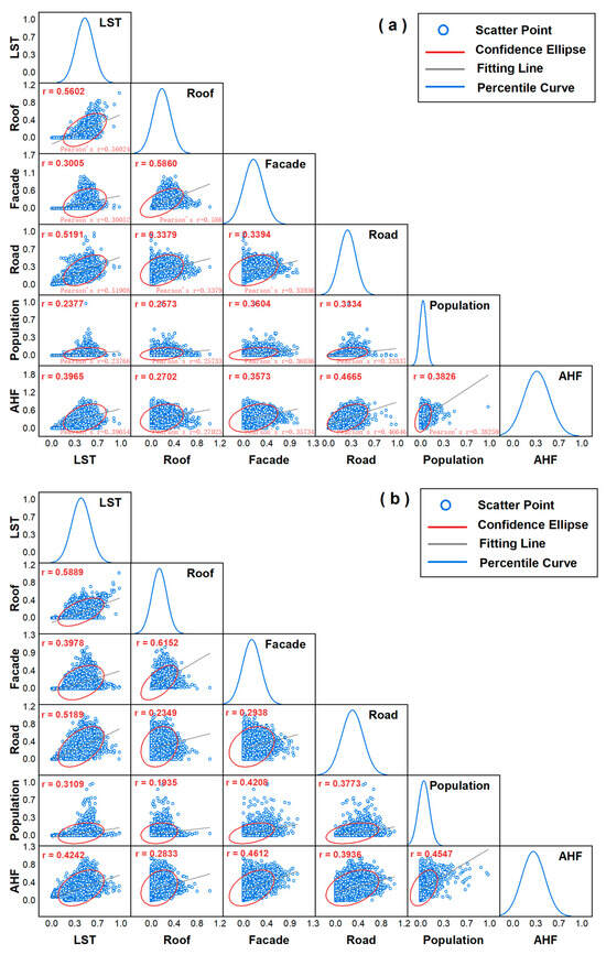 The matrix scatter plot between LST and each impact factor: (a) Hefei and (b) Xuzhou.
