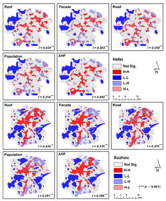 In Xuzhou, roof displayed the highest bivariate spatial correlation with LST among all factors, with a Moran’s I value of 0.430, reflecting a strong spatial linkage between roof sunlight exposure and elevated LST in densely developed urban areas. AHF in Xuzhou showed a moderate spatial correlation with LST, with a Moran’s I value of 0.394, indicating a more dispersed spatial relationship compared to the clustering observed between LST and roof or road sunlight exposure.