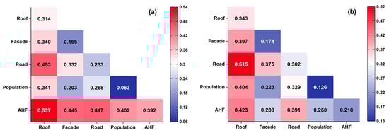 As shown in Figure 10, the interaction detector results indicate that in Hefei, the interaction between roof and AHF had the greatest impact on LST, with an interaction coefficient of 0.537. This finding suggests that in areas with dense building clusters and concentrated human activities, these factors jointly intensify LST. Following that, the interaction between road and AHF ranked second, with a coefficient of 0.447, further supporting the importance of roads and AHF in Hefei’s thermal environment.