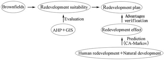 In this work, we considered the Wangping brownfield in Beijing (China) as the study area and developed a two-step brownfield redevelopment model based on the “suitability evaluation+effect evaluation” concept. We used analytic hierarchy process (AHP) analysis and GIS software (Arcmap 10.6) to evaluate the suitability of the redevelopment of different brownfield plots. Brownfield redevelopment planning was designed based on the evaluation results and design method of landscape planning. The CA–Markov model was used to predict the land use situation in the brownfield area by 2030, for the conditions of human and natural development, to determine the effects of redevelopment planning (Figure 1). This study provides new ideas for the redevelopment of urban brownfield land from the perspectives of environmental science and urban planning.