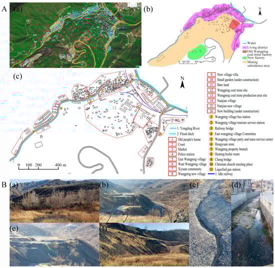 Figure 2. Basic information on the current situation of the Wangping brownfield. (A) Surface information for Wangping: (a) satellite image of the current status of the surface; (b) function partition diagram; and (c) detailed plan. (B). Damage to the ecological environment in Wangping: (a) ground depression; (b) mountain collapse; (c) ground cracks; (d) water pollution; (e) landslides; and (f) coal gangue.