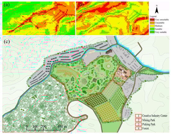 Figure 4. Wangping brownfield redevelopment: (a) redevelopment suitability of the brownfield park; (b) redevelopment suitability of the agricultural picking garden; and (c) overall plan for the redevelopment of the area.