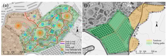 Figure 5. Design of the Wangping brownfield redevelopment plan: (a) brownfield park; and (b) agricultural picking garden.
