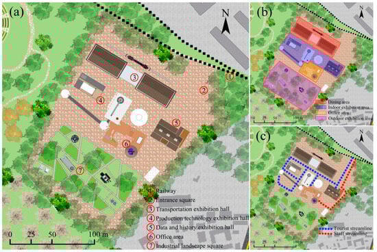 Figure 6. Design of creative industry center: (a) landscape node; (b) functional area; and (c) personnel flow line designs for the study area.