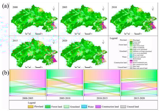Figure 7. Land use change in Mentougou district during 2000–2020: (a) land use; and (b) transition trend.