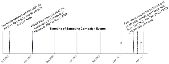 The sampling campaign was carried out from October 2021 to March 2022, collecting soil samples before and after the rain event, sediments transported by the runoff, pore water, and runoff water samples during the rain event.