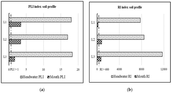 The metal(loid)s that showed similar concentrations in the mouth for L1–L2 were As (22–21.9 mg kg−1), Cd (1.96–1.75 mg kg−1), Cr (13.8–13.1 mg kg−1), Cu (19.0–17.6 mg kg−1), Fe (22,379–21,444 mg kg−1), Mn (1295–1185 mg kg−1), Ni (16.7–16.9 mg kg−1), and Zn (683–637 mg kg−1), while Pb increased by 33% (876–1164 mg kg−1) (Supplementary Material-Table S2). In contrast, a decrease in the concentrations of As (67.3%), Cd (66.9%), Cu (7.71%), Fe (24.7%), Mn (32.3%), Pb (84.5%), and Zn (68.3%) was reported between L2 and L3. The metal(loid)s with mean CF > 1 were as follows: As (2.43), Cd (4.5), Cu (1.40), Mn (1.42), Pb (79.2), and Zn (12.3) (Table 2). The PLI exhibited similar values for L1 (3.45) and L2 (3.40), while L3 (1.67) showed a decrease of 50.8% compared to L2 (Figure 3a). At the mouth of the dry riverbed compared to the headwater, the PLI was lower, L1 (19.2% lower), L2 (20.0% lower), and L3 (9.13% lower). Similarly, the RI showed values of 716 for L1, 850 for L2, and 173 for L3 (Figure 3b). The highest Eri values were for Cd (134) and Pb (396); corresponding values in the headwater were 96.0% and 92.3% lower, respectively (Supplementary Material-Table S1).