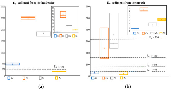 Hakanson [37] categorized the potential ecological risk of individual metals (Eri) into five levels: low (Eri < 40), moderate (40 ≤ Eri < 80), considerable (80 ≤ Eri < 160), high (160 ≤ Eri < 320), and very high (Eri ≥ 320); while values of RI < 150 are categorized as low; 150 ≤ RI < 300 moderate; 300 ≤ RI < 600 high; RI ≥ 600 significantly high.