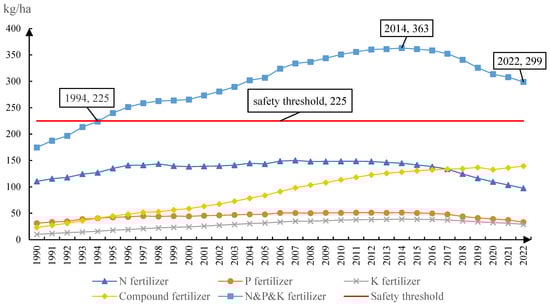 Excessive chemical fertilizer use has long been a critical issue in China’s agriculture [1], compromising production efficiency and causing widespread environmental pollution [2]. This poses substantial risks to food safety [3,4]. In the 1970s, China imported fertilizer production equipment from the Soviet Union, the Netherlands, and the United Kingdom, leading to a sharp increase in chemical fertilizer use. Fertilizer application rates rose from under 50 kg per hectare in 1970 to about 100 kg per hectare by 1979. By the 1980s, China had become the world’s largest fertilizer consumer [5]. With rapid agricultural growth, China’s fertilizer usage surpassed international environmental safety thresholds in the 1990s. Data from the National Bureau of Statistics of China indicate that, since 1994, the total application of nitrogen (N), phosphorus (P), and potassium (K) fertilizers in agriculture has consistently surpassed 225 kg per hectare. This usage reached a peak of 363 kg per hectare in 2014 and was recorded at 299 kg per hectare in 2022 (Figure 1).
