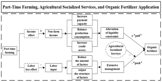 Using household data from four major apple-producing counties in Shaanxi, China, this study examines the impact of part-time farming on organic fertilizer use. The research has three objectives: (1) to clarify the mechanisms by which non-farm labor participation influences organic fertilizer application; (2) to differentiate between the ‘push’ and ‘pull’ effects, identifying the varying impacts of different levels of non-farm labor participation; and (3) to assess the moderating role of agricultural socialized services.