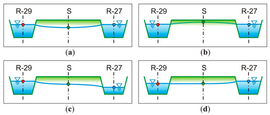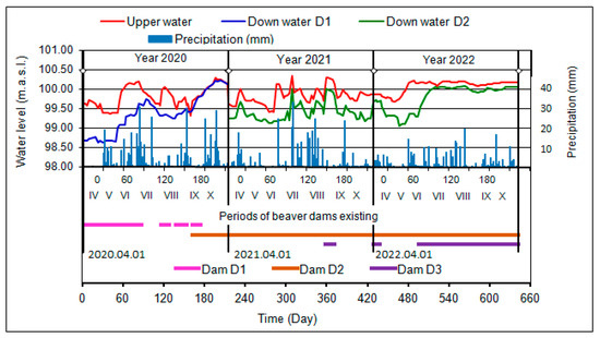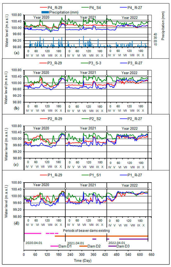 - Water resources of the Mała River and adjacent ditches were closely related to the activity of beavers and atmospheric precipitation occurring in this area. For the beaver dam in location D1, in the beginning of 2020, the water levels above the dam were 1.0 m higher than below the dam (Figure 2), which resulted in water from the R-29 ditch irrigating the plot, while it was partially drained by the R-27 ditch (Year 2020 in Figure 3). For the locations of dams D2 and D3 in 2022, water levels in ditches R-29 and R-27 were similar (Year 2022 in Figure 3).
