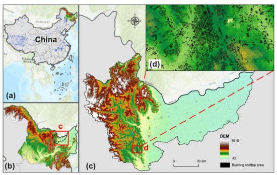 Location of the study area. (a) The entire territory of China, (b) Heilongjiang Province, (c) Hegang City, (d) A schematic diagram of rooftops in the center of Hegang City.