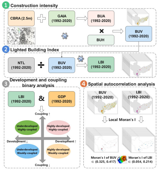 This study is structured into four steps, conducting a long-term sequence analysis of land-use changes in Hegang from 1992 to 2020 across four dimensions: construction intensity (measured by Built-up Volume, BUV), its coupling with actual utilization intensity (measured by Lighted Building Index, LBI), the evolution of the binary relationship between coupling and development over the past three decades, and the spatial autocorrelation of both BUV and LBI annually. The detailed technical framework is shown in Figure 2.