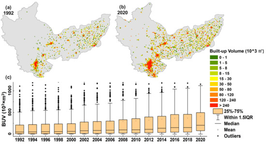 Spatiotemporal distribution of Built-up Volume (BUV) in Hegang city from 1992 to 2020. (a,b) represent the spatial distribution of BUV for construction land in Hegang for the year 1992 and 2020, respectively; (c) BUV statistics of build-up land pixels per year.