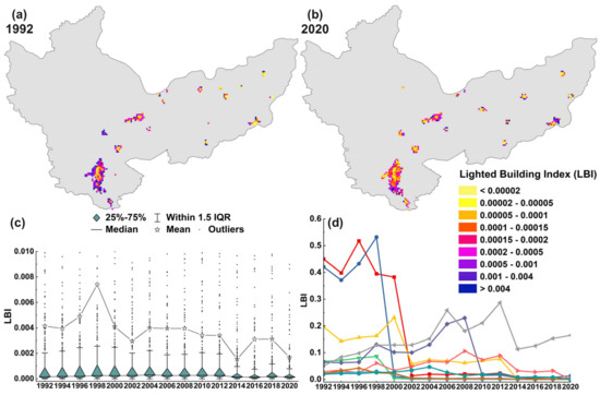 Spatiotemporal distribution of the Lighted Building Index (LBI) in Hegang city from 1992 to 2020. (a,b) represent the spatial distribution of the LBI for construction land in Hegang for the year 1992 and 2020, respectively; (c) LBI statistics of build-up land pixels per year; (d) Temporal changes in the LBI from 1992 to 2020 for the top 10 pixels with the highest LBI values in Hegang in 1992.