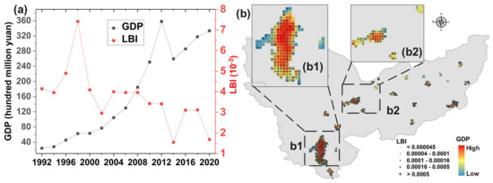 The average LBI and the total GDP from 1992 to 2020 can reflect the urban land-use coupling degree and the level of economic development, respectively (Figure 5a). Over the period from 1992 to 2020, the coupling degree generally showed a downward trend, while GDP, despite a decline in 2014, has generally been on an upward trajectory. In terms of spatial correlation, Figure 5b shows that pixels with higher GDP in the city center have a lower LBI, whereas pixels with lower GDP in the urban–rural fringe and suburban areas have a higher LBI. This phenomenon may be attributed to excessive construction in the city center due to overconfidence on the part of local governments and fiscal incentives.