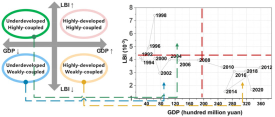 We conducted an integrated analysis of the binary relationship between the total GDP and the Lighted Building Index (LBI) in Hegang City from 1992 to 2020. The two-dimensional space defined by these two indicators was divided into four quadrants, representing ‘Highly developed, Highly coupled’, ‘Highly developed, Weakly coupled’, ‘Underdeveloped, Highly coupled’, and ‘Underdeveloped, Weakly coupled’. By performing pixel-by-pixel time series analysis and spatial time series analysis on the GDP and LBI data for every other year over the 1992–2020 period, spanning 15 phases, we mapped out the developmental trajectories across different years. From these analyses, we summarized the evolution of the relationship between coupling and development.