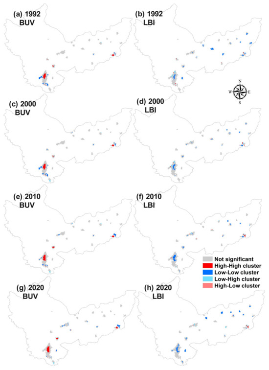 Local Moran’s I of BUV and LBI in 1992, 2000, and 2020.