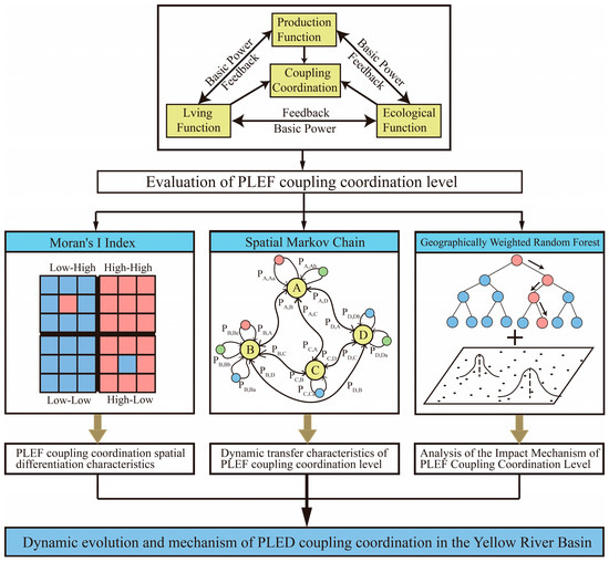In summary, this study’s goal was to (a) construct an assessment framework for the coupling coordination level of the PLEF in the YRB; to investigate the basic characteristics and key issues of the PLEF in the YRB; and to enrich the theoretical framework of associated studies. (b) Using a spatial Markov chain model, the dynamic evolution mechanism of the PLEF coupling coordination level in the YRB was investigated, and the underlying development patterns were identified. (c) On the basis of considering spatial heterogeneity, the GWRF model was used to reveal the importance of different variables for the coupling coordination level of the PLEF, and their influencing mechanisms were explored, thereby providing empirical suggestions for improving the coupling coordination level and high-quality advancement of the PLEF in the YRB. In Figure 1, the study framework is displayed.