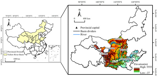 The YRB is an ideal research area for the study of the PLEF coupling coordination level, based on the natural watershed division of the Yellow River Water Resources Committee, considering the completeness of the research area and the availability of the data (Figure 3) [1,51]. First, the YRB serves as a crucial environmental boundary, but its geological structure is fragmented, and the ecological environment is fragile [52]. After a long period of large-scale development, many environmental problems have arisen, including severe land desertification, soil erosion, and even extreme weather events such as sandstorms. Second, the YRB spans three strategic locations in the eastern, main, and western-central regions, with a population that accounts for over 30% of the total population and a total area that accounts for 36.91% of the total area of China. Residents’ living conditions vary greatly, and the higher, medium, and lower reaches differ significantly in terms of development level [53]. Third, the YRB’s ecological environment is delicate and has long been controlled by a crude and energy-intensive development model, which has caused the ecological environment in the area to continuously deteriorate. Nonetheless, the area needs to enhance its comparatively low degree of industry and urbanization growth. Consequently, the inconsistency between the two continues to be a significant concern for the YRB’s future growth [54]. Lastly, the YRB is the primary place where national policies are implemented. The YRB’s land use function in the geographical distribution pattern has been impacted by policies including the Belt and Road Initiative, the Western Development Strategy, and the conversion of agriculture to forests [55]. Furthermore, the government has made it apparent that the YRB is crucial to China’s ecological security, and social and economic advancement, and has designated it as a demonstration region for high-quality development. The aforementioned traits have had a significant influence on the YRB’s evolution. In order to optimize regional ecosystems and achieve high-quality sustainable development, it is crucial to investigate the coordinated evolution and influencing mechanism of the PLEF in the YRB.