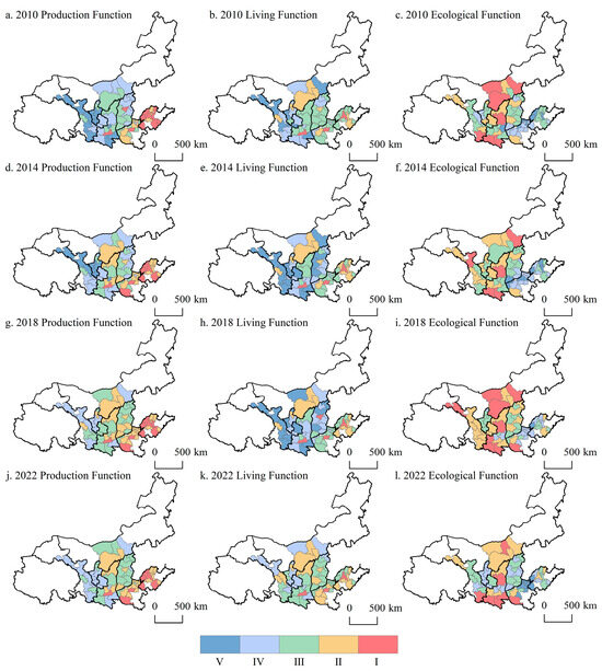 Based on the PLEF evaluation-index system constructed in the article, combined with the weights of each index, the PLEF level of each city over the years was calculated, and each functional level was split into five levels using the natural breakpoint approach, gradually decreasing from levels I to V (Figure 4). The findings indicate that the PLEF shows a general geographical differentiation phenomenon, with higher ecological function level differences and low values in the west. The three functions indicate the following: (a) there are many cities with relatively low production levels in the YRB, which are primarily concentrated in the higher elevations of Gansu and Ningxia, with significant differences between East China and West China. Cities in Shandong Province consistently showcase a high level of performance, while the level of urban living functions in Shanxi Province has significantly increased. (b) With the high-level cities mostly found in the provincial capital cities and a sharp decline in low-level cities, particularly in the middle and lower reaches of cities like Baiyin, Ankang, Qingyang, and Linfen, the overall living standard function in the YRB shows a U-shaped change trend. (c) With particularly notable trends in Gansu, Ningxia, and Shanxi Provinces, the YRB’s general ecological function level is on the decline. The southern region has the strongest overall pattern of geographical differentiation, followed by the northern region and other regions. The contiguous regions of Longnan, Hanzhong, Ankang, and Nanyang are home to the majority of high-level cities with ecological functions.
