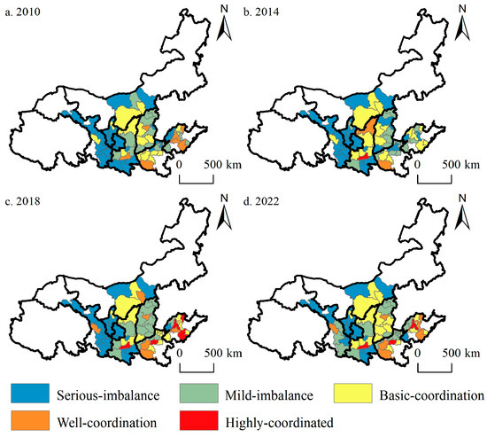 Spatial distribution of the PLEF coupling coordination level in the Yellow River Basin (YRB) from 2010 to 2022.