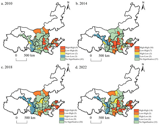 Only clustering kinds may be seen in the global Moran’s I data; specific spatial correlation types cannot be seen. Consequently, areas with p < 0.1 may be defined using local Moran’s I, and local indicators of spatial association (LISA) diagrams were produced (Figure 6). Interestingly, the provinces of Shandong and Henan have the most concentration of high–high clustering regions. On the other hand, Gansu Province’s southern region had a considerable number of low–low clustering zones, suggesting that the PLEF coupling coordination level there was typically low. The number of high–high and low–low clustering cities in the YRB expanded dramatically between 2010 and 2022, and the polarization impact between cities became considerable when looking at the number of associated cities.