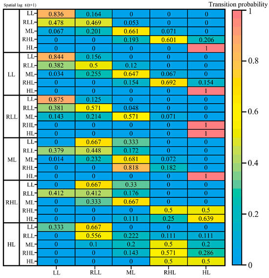 A transition probability matrix is provided using the Markov chain to show each person’s dynamic development process throughout time [42]; the probability distribution and evolution trend of different phenomena in each city can be calculated, and the development characteristics of PLEF coupling coordination in cities in the YRB can be revealed. However, traditional Markov chain models cannot capture the important role of spatial spillover effects in the evolution of the inherent state of a city. Therefore, on the basis of the classic Markov chain model, the notion of the spatial lag was established [43,44] to explore the influence of the coupling and coordination level between the domain and the city on the likelihood of self-transition. In contrast to traditional Markov chain models, conditional transition matrices for k × k were generated, denoted as . These matrices indicate the probability of the coupling coordination index of a given city changing from types i to j after d years, under the condition of a type-λ urban spatial lag coupling coordination index in the current year. This can be expressed as follows: