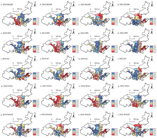 Figure 10 shows the spatiotemporal distribution of the significance of the factors influencing the coupling coordination level of the PLEF in the YRB from 2010 to 2022, which is based on the economic level. According to the results, the cities exhibited a significant clustering distribution of high-importance areas under the economic level criterion layer, and the nighttime light index exerted the most significant influence on changes in the coupling coordination level, whereas the importance of the per capita disposable income was the lowest. In particular, there was a trend in mutual transformation between high- and low-value areas, as the high-value areas of the per capita GDP gradually moved from the southern part of Gansu Province downstream of the YRB to the northern part of Shan-xi Province and cities like Jinan, Linyi, and Rizhao in Shandong Province. The spatial pattern and changes in the importance of the per capita general consumption expenditure were similar to those in the importance of the per capita disposable income, but the number of high-value areas gradually decreased. In 2022, only six cities, namely, Ulanqab, Binzhou, Rizhao, Hebi, Puyang, and Datong, were high-value areas. The valuable sections of the nighttime light index mainly occurred in the upper reaches of the YRB, gradually shifting from the northeastern part of Gansu Province to the southern parts of Gansu and Shanxi, with fewer low-value areas, which were spread out only in Baotou, Hohhot, Ulanqab, Dezhou, and Zibo. The spatial pattern of the importance of the average wage of on-the-job workers changed significantly. High-value areas shifted from Zhangye and Wuwei to cities such as Bayannur, Ulanqab, and Hohhot, whereas low-value areas shifted from cities in the middle reaches of the YRB to scattered cities such as Yuncheng, Nanyang, and Pingdingshan.
