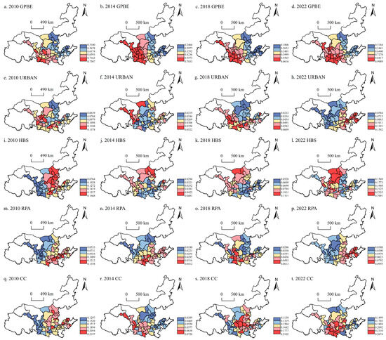 The spatiotemporal distribution of the parameters affecting the PLEF’s coupling and coordination level in the YRB between 2010 and 2022 is shown in Figure 11. The importance of general public budget expenditure was greater than that of the other variables and exhibited a sustained and rapid upward trend. From the viewpoint of influencing factors, the high-value areas of general public budget expenditure continued to spread, gradually expanding from Longnan, Hanzhong, and Qingyang in 2010 to most cities in the lower reaches of the YRB, whereas the low-value areas were concentrated mainly in northwestern Shanxi Province and Shandong Province. The importance level of the urbanization rate indicated a development trend of first reducing and then increasing. In Shandong Province, high-value regions moved to most cities from places like Zhongwei, Guyuan, Shangluo, etc., whereas low-value areas were mostly found in Gansu and Ningxia. The high-value areas of the number of beds per thousand residents were mainly focused in the northern cities of the YRB, with weak transfer phenomena, whereas the low-value areas gradually shifted from the upper reaches of the YRB to cities in the middle and lower reaches, such as Taiyuan, Luoyang, Binzhou, Dongying and other cities. The distribution of per capita road space remained relatively stable, with high-value regions primarily found in urban centers like Anyang, Puyang, Jinan, and Linyi, while low-value regions were mostly located in the upper reaches of the YRB. The significance of the communication coverage rate has stayed fairly consistent. In 2010, there were few high-value areas, and by 2022, the southern part of Shaanxi Province, Yuncheng, and Jincheng had gradually developed into high-value areas, whereas the number of low-value areas continued to decrease, thereby shifting from Gansu and Ningxia Provinces to cities such as Bayannur, Baotou, and Nanyang.