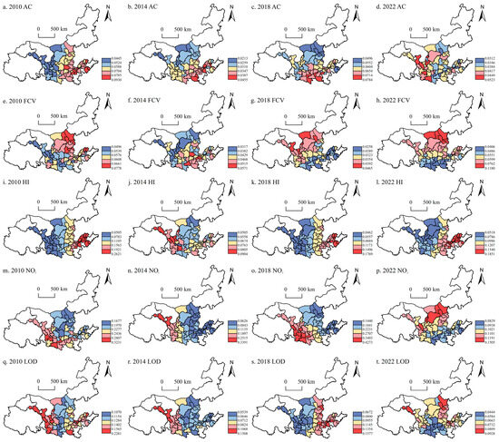 In this research, data from 2010 to 2022 were evaluated. To ensure spatial consistency of the data, ArcGIS 10.6 was used to uniformly transform the various data coordinate systems. (a) The China Urban Statistical Yearbook and the China Urban Construction Statistical Yearbook for the 2011–2023 period, together with the national economic and social development bulletins of the different cities, were the primary sources of the statistical data. (b) Land use data were sourced from the Wuhan University China Land Cover Dataset (CLCD) (http://doi.org/10.5281/zenodo.4417809, accessed on 25 June 2024). (c) PM2.5 and NO2 data were obtained from the China High Air Pollutants website of the Qinghai Tibet Plateau Science Data Center. The Multi-Angle Implementation of Atmospheric Correction (MAIAC) aerosol optical depth (AOD) products of the Moderate Resolution Imaging Spectroradiometer (MODIS) were used to fill in spatially lacking data. (d) Digital elevation model (DEM) data were derived from the 30 m DEM terrain data product of the National Aeronautics and Space Administration (NASA), which are processed and improved on the basis of the Shuttle Radar Topography Mission and provide high accuracy. (e) The National Oceanic and Atmospheric Administration’s (NOAA) National Centers for Environmental Information (NCEI) watershed had meteorological stations from which precipitation data were collected. (f) The National Qinghai Tibet Plateau Data Center provided the vegetation coverage index, and the Chinese region’s 250 m normalized vegetation index dataset was used.
