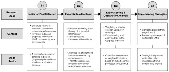 This study adopted a balanced, indicator-based approach to enable a comprehensive and broadly applicable evaluation of NMIR initiatives. The methodology was designed to meet two key objectives: to identify indicators that effectively capture the place quality and to systematically assess the outcomes and long-term effects of NMIR initiatives. It was structured around a four-stage framework, as outlined in Figure 2. Step 1 involved a comprehensive review of the existing literature to compile a preliminary list of potential indicators. In Step 2, semi-structured interviews were conducted with various stakeholders, including planners, residents, and government officials, to validate the relevance of the identified indicators and adapt them to the specific context of China. Step 3 involved the application of the Analytic Hierarchy Process (AHP) and Fuzzy Comprehensive Evaluation (FCE) to assign weight and to rank the indicators according to their importance and to evaluate them comprehensively. In Step 4, the findings from the previous steps were synthesised to propose policy recommendations to enhance future NMIR applications.