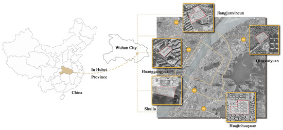 Specifically, five old neighbourhoods in Wuhan were selected for in-depth analysis (Figure 3): Shuilu, Huajinhuayuan, Jiangjunxincun, Qingcuiyuan, and Huanggangyuan. Except for Jiangjunxincun, which dates back to 1990, the others were established between 1995 and 2000. These areas span various districts within inner Wuhan, showcasing a blend of mature development and the pressing need for upgrades due to ageing infrastructure and facilities that no longer suffice for the current inhabitants. Shuilu, notable for being among Wuhan’s largest older residential areas, is situated south of Wuchang Ancient City, spanning 0.55 km². Huajinhuayuan, in the Wuchang District, saw NMIR implementation through the joint efforts of 20 residents and urban planning experts. Positioned in Dongxihu District, Jiangjunxincun is distinguished as both the oldest and most remote. Qingcuiyuan lies in Qingshan District, an area known historically for its industrial activities. Lastly, Huagangyuan, in the highly developed Jiang’an District, is the newest addition to these neighbourhoods.