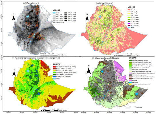 - CSA. Agricultural Sample Survey Report on Area and Production of Major Crops (Private Peasant Holdings, Meher Season 2011/2012 (2005 E.C.)). The FDRE Statistical Bulletin, Volume VII. 2012. Available online: https://searchworks.stanford.edu/view/5757166 (accessed on 4 July 2024).