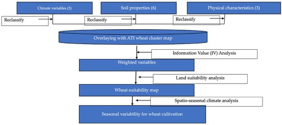 The reclassification process involved adapting the original criteria to align with contemporary crop requirement standards, ensuring a comprehensive evaluation of land quality for optimal wheat cultivation. This approach integrates historical standards with updated requirements to accurately assess the suitability of different land areas for wheat production. The overall workflow is illustrated in Figure 2.