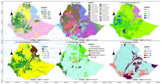 The study on land suitability for wheat cultivation in Ethiopia integrates a variety of data such as soil characteristics, climate data, and topographic information. Soil data were sourced from [39] and encompassed essential physical and chemical properties, including soil type, percentage of coarse fragments (CFRAG), drainage, gypsum content, soil organic carbon (SORGC), nitrogen content, and pH levels [40,41,42,43]. All soil information was projected using the Universal Transverse Mercator (UTM) coordinate system with the World Geodetic System 84 (WGS 84) datum in Zone 37 N.