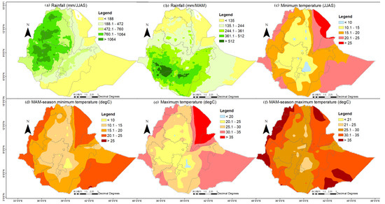 Similar studies were reported on the shifting/decreasing/increasing of wheat suitability lands, using different scenario projections [18,20,23,51,52,76,84,90,94,95,96,97,98]. Climate change impacts wheat yields through various interconnected factors, including increased temperatures, altered rainfall patterns, and higher atmospheric CO2 concentrations. Elevated temperatures can stress wheat plants, leading to reduced yields and poorer grain quality due to heat-induced accelerated development and diminished grain filling [18,69,84,88,99,100]. Changes in rainfall can result in either drought stress or excessive moisture, both of which affect soil health and water availability critical for wheat growth [76,101,102]. Conversely, higher atmospheric CO2 levels may initially boost wheat growth and yields through enhanced photosynthesis; however, this benefit may be offset by other stressors like heat and water scarcity [97]. Climate unpredictability has been prevalent, and farmers have been unable to predict the occurrence of favorable rainfall and temperature conditions for wheat growing. Trends in seasonal rainfall analysis (Figure 7, Figure 8, Figure 9 and Figure 10) showed that that there would be annual rainfall variability over several parts of the country. Rainfall variability revealed the difference in both time and space across the country. Seasonal temperatures revealed significantly increasing trends across the country. This might have implications for agricultural planning, crop selection, and adaptation measures to sustain wheat production in Ethiopia. Thus, the combined effects of these climate variables necessitate adaptive management practices to sustain wheat production particularly in Ethiopia, strengthening the resilience of agricultural sector, as well as protecting the smallholder farmer’s livelihoods from climate induced impacts and ensuring food security.