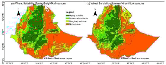 Current seasonal land suitability for wheat cultivation during MAM (a) and JJA (b) in Ethiopia under the current conditions.