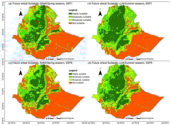 Future land suitability projections for wheat cultivation from 2020 to 2050 under SSP1 during MAM (a) and JJA (b) and under SSP5 during MAM (c) and JJA (d) in Ethiopia.