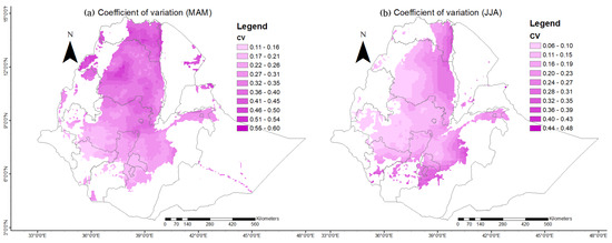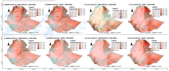 The spatial patterns of the coefficient of variation across different CMIP6 scenarios indicate that non-suitable areas exhibit greater variability compared to future wheat suitability regions (Figure 10). Notably, the western Afar and central Rift Valley regions are projected to face significant rainfall variability in the 2040s, which could negatively impact wheat production, alongside concerns related to soil pH values (see Figure 3a). However, with the implementation of adequate irrigation infrastructure and soil treatment, these regions may still maintain wheat yields despite the high rainfall variability [84,103].