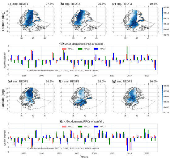 Within the seasonal suitability areas, climatological analyses were conducted to assess long-term average rainfall patterns, detect significant trends using regression and the Mann–Kendall test during 1981–2023 [61,62], and calculate the coefficient of variation (CV) to quantify the variation of each grid points [38]. In addition, to identify the dominant patterns of seasonal variability within the seasonal suitability areas, a Rotated Empirical Orthogonal Function (REOF) analysis and its time component, Rotated Principal Component analysis (RPCA) analysis, were performed [14,63,64]. The analysis focused on identifying the three most dominant seasonal variability areas in relation to wheat cultivation. Overall, the integration of GIS-based suitability mapping, and climatological and variability analyses of seasonal current and future climate provides a comprehensive framework for assessing wheat cultivation dynamics. This integrated approach provides a nuanced understanding of the factors influencing wheat cultivation across Ethiopia’s diverse agro-ecological zones, crucial for agricultural planning and resilience in a changing climate.