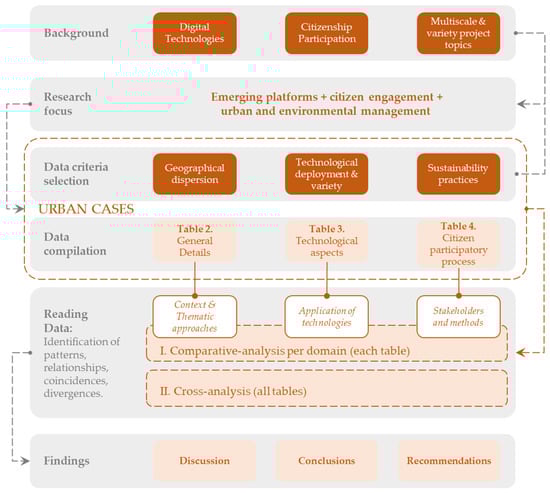 Figure 1 illustrates the methodological approach adopted to analyze the impact of emerging platforms on citizen participation and urban and environmental management. This methodological process starts with a review of three fundamental concepts: digital technologies, citizen participation, and multi-scale projects, which serve as a theoretical framework for this study. From this context, a research focus is established on the intersection between technological platforms, citizen engagement and urban management, which guides the comparative analysis and cross-checking of data, looking for significant relationships between the selected variables.