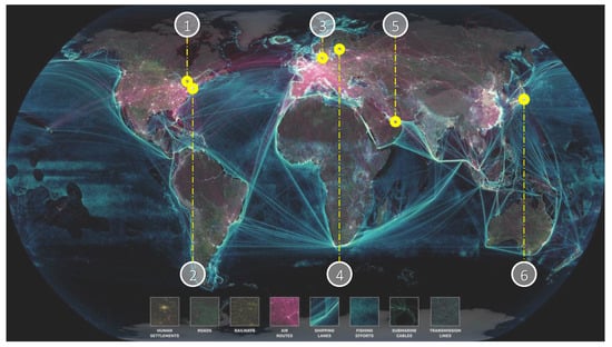 These cities, located in the northern hemisphere, are at the epicenter of human activity and technological advancement, driven by industrial and digital development. Toronto, New York, Copenhagen, Helsinki, Dubai, and Tokyo are not only centers of innovation but also examples of how urban environments are becoming key platforms for the digital revolution. Globally, cities act as nodes in a vast network of technological and economic infrastructures, shaping what is known as the Anthroposphere (Figure 2): a term that captures the footprint of human activity on the planet in both infrastructural and networked aspects with global reach. In this sense, the Anthroposphere is not only a map of the human footprint but also a reflection of the potential that cities have to generate a positive impact through technology and the capacity for global influence as a result of the interdependencies created by globalization [3].