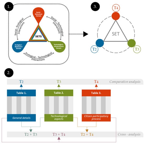 Schematic of the data analysis based on the SET (socio–eco–technological system) framework, illustrating the interaction between the social–behavioral, ecological–biophysical, and technological–infrastructural domains, and their influence on citizen participation and urban sustainability. (1.) SET template [76]: The human ecosystem as socio–eco–technological systems; (2.) Data tables (projects); (3.) Integration data tables with SET template.