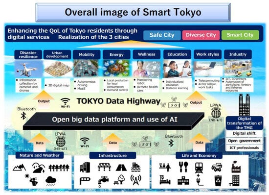 - Tokyo Metropolitan Government. Smart City Tokyo. 2024. Available online: https://www.smart-tokyo.metro.tokyo.lg.jp (accessed on 27 September 2024).