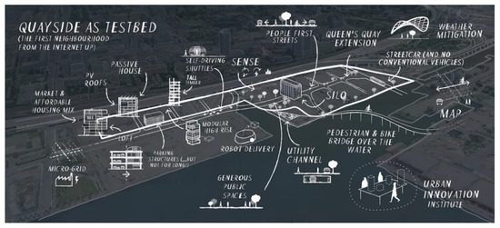 Quayside Smart Neighborhood (Toronto, Canada). A conceptual sketch showing the urban intervention plan concept integrating people-centered urban design with advanced technology [81].