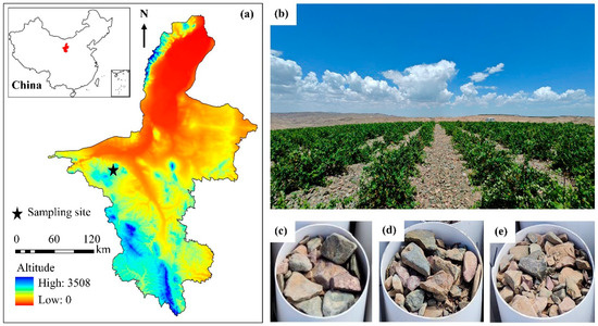 Elevation map of the study areas and sampling site: (a) provincial administrative (Ningxia Hui Autonomous Region, China) elevation map of the study areas; (b) general view of the research sites; (c) samples gravel-mulched for 1 year; (d) samples gravel-mulched for 10 years; (e) samples gravel-mulched for 20 years.