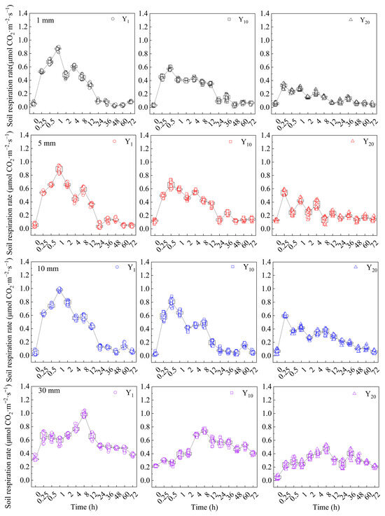 Following rainfall, we observed a sudden increase in respiration rates in gravel-mulched soils (Figure 2). Soil respiration pulse events occurred rapidly within 1 h of soil rewetting when rainfall was 1 mm, 5 mm, and 10 mm. It is noteworthy that the occurrence of these events was related to the aging of gravel mulching. Specifically, respiration rates peaked at approximately 1 h, 0.5 h, and 0.25 h after soil rewetting in gravel mulching for 1 years, 10 years, and 20 years, respectively, and then declined progressively over a period of approximately 1 day.